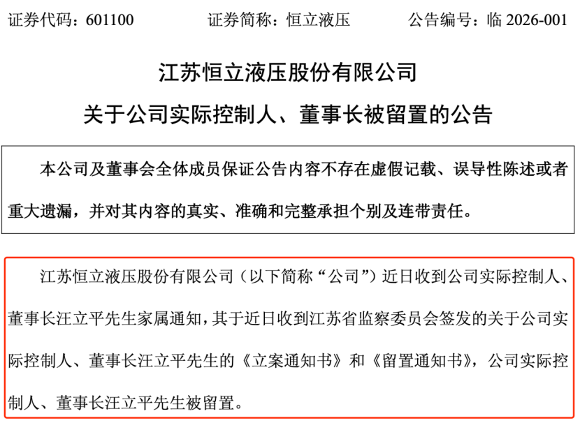 3月20日下午,恒立液压发布公告称,公司近日收到实际控制人、董事长汪立平家属通知,其于近日收到江苏省监察委员会签发的关于公司实际控制人、董事长汪立平的《立案通知书》和《留置通知书》,公司实际控制人、董事长汪立平被留置。